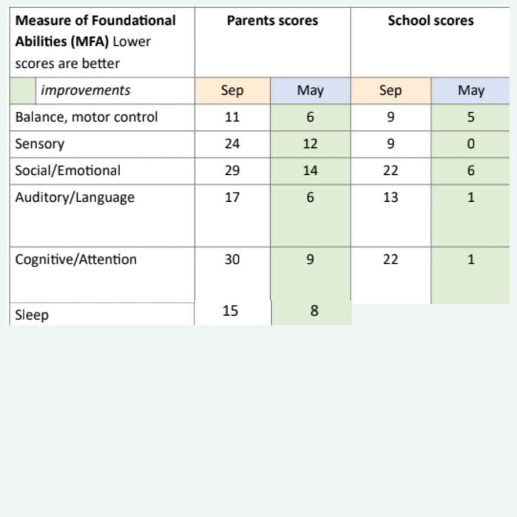 Quantitatively, Petra improved her score on the Measure of Foundational Abilities (MFA) assessment and questionnaire reports from her parents and teachers: