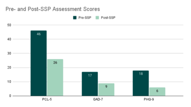 - PTSD (PCL-5): Score decreased by 20 points, shifting symptoms from the clinical threshold to subclinical.