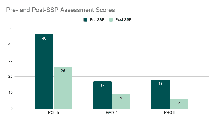 Janine demonstrated clinically meaningful reductions across all three outcome measures (GAD-7, PCL-5, PHQ-9) over the course of treatment with the SSP combined with psychotherapy.